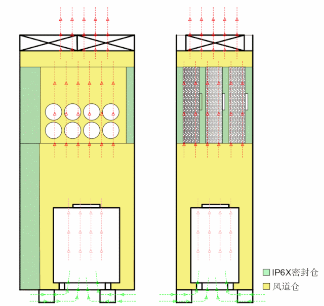 對灰塵不敏感而又發熱量大的器件,比如電感,變壓器等,可以放置在風道內,加上散熱器、風扇,形成一個低防護、高效散熱的風道。而對于敏感器件,可以放置在機柜內獨立的密閉空間,他們的連接線纜可以采用毛刷或塔形橡膠密封件進行密封。這樣在柜內形成一個IP6X的防護區域,滿足了敏感器件的高防護要求。相對內置空調散熱、熱交換器散熱、液冷散熱來說,強制風冷散熱加分級防護運行穩定可靠、維護便利、成本低。