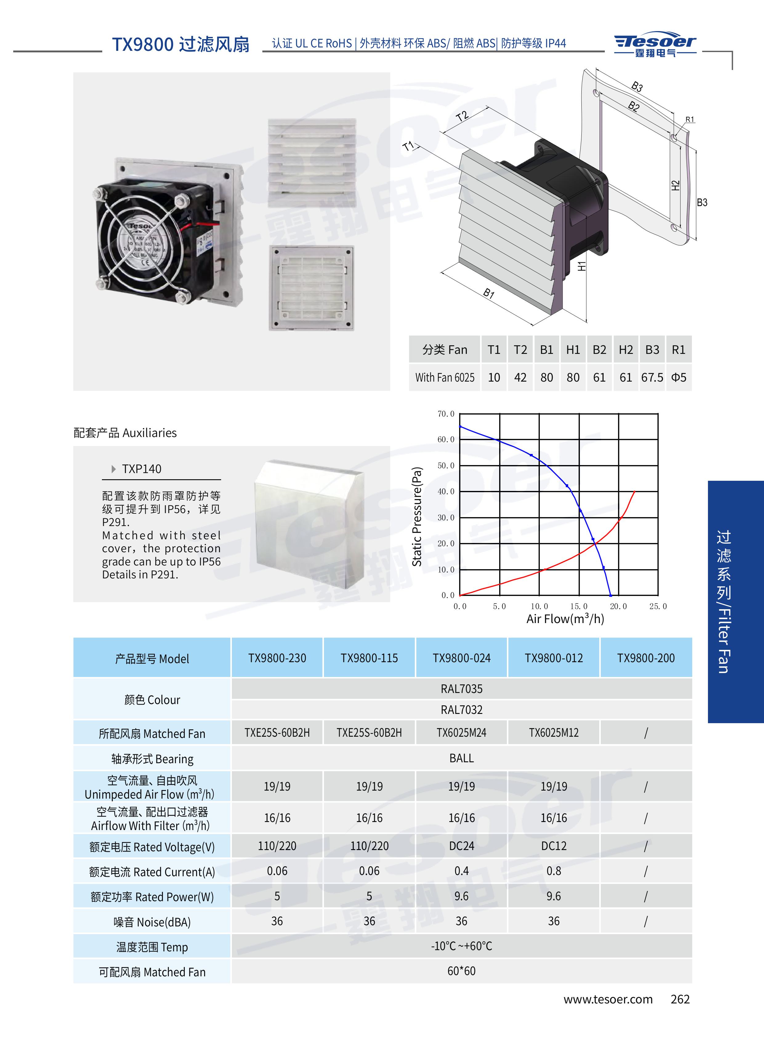 TX98系列風扇及過濾器,一款過濾器可以配不同品種風機,能夠按照您的實際需求選擇適合您的風量與參數。無紡布纖維過濾棉用于防止10微米以上的灰塵顆粒,螺絲固定安裝,防護等級可達IP44級別。