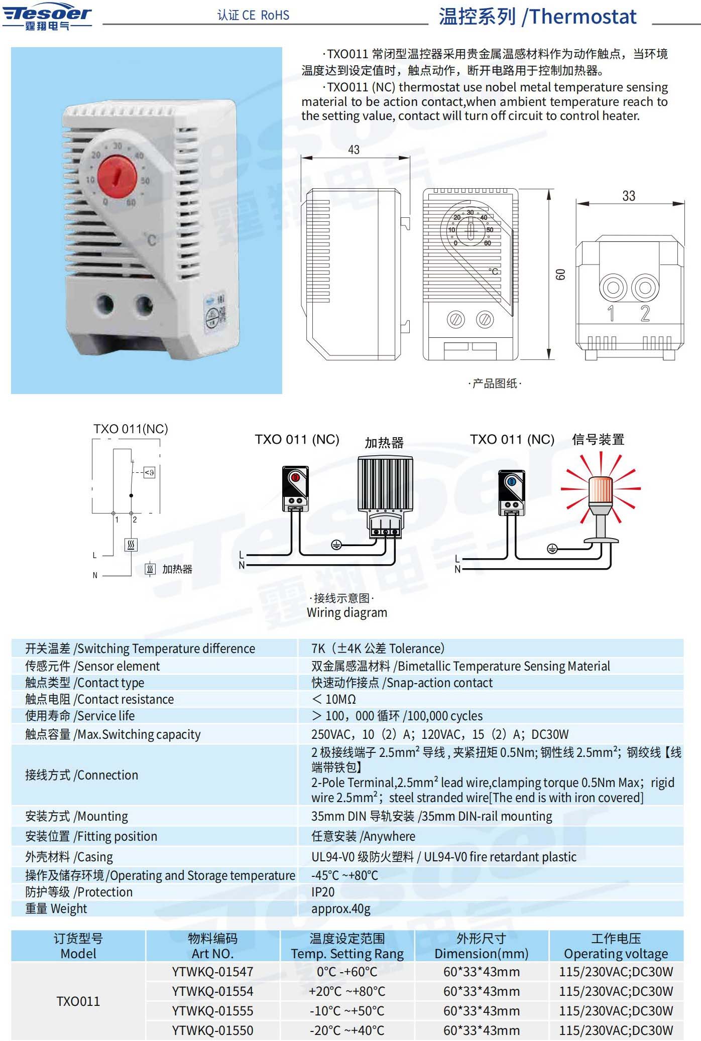 溫控器觸電(通常是開放的 NC)采用雙金屬感溫材料,鏈接制造商的過濾器調(diào) 節(jié)風機和換熱器或開關(guān)信號,當溫度超過設(shè)定值時,接點開啟啟動,其特點是 設(shè)定范圍廣、體積小、安裝便捷、開關(guān)性能高等