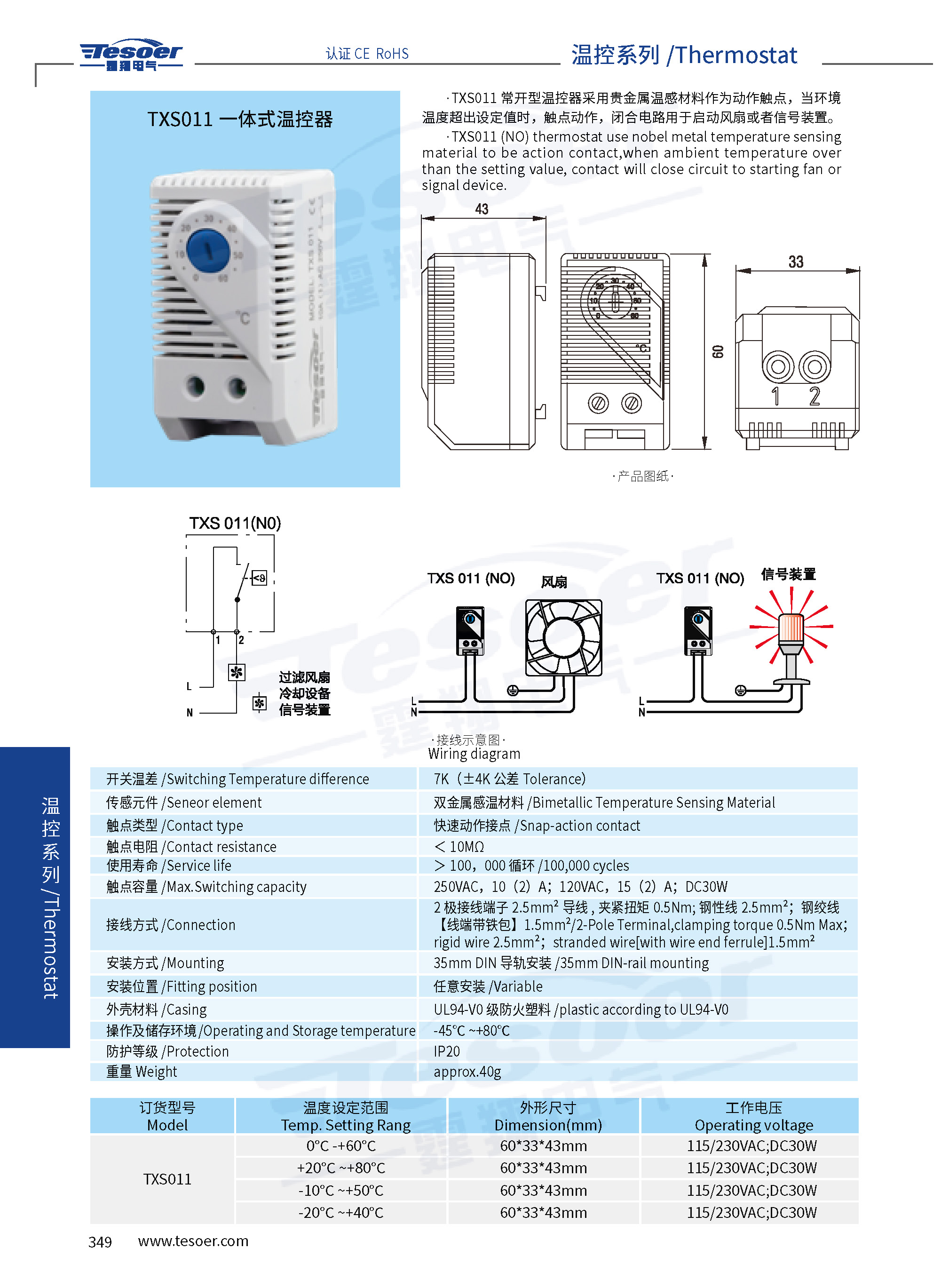 溫控器觸電(通常是開(kāi)放的 NO)采用雙金屬感溫材料,鏈接制造商的過(guò)濾器調(diào) 節(jié)風(fēng)機(jī)和換熱器或開(kāi)關(guān)信號(hào),當(dāng)溫度超過(guò)設(shè)定值時(shí),接點(diǎn)閉合啟動(dòng),其特點(diǎn)是 設(shè)定范圍廣、體積小、安裝便捷、開(kāi)關(guān)性能高等