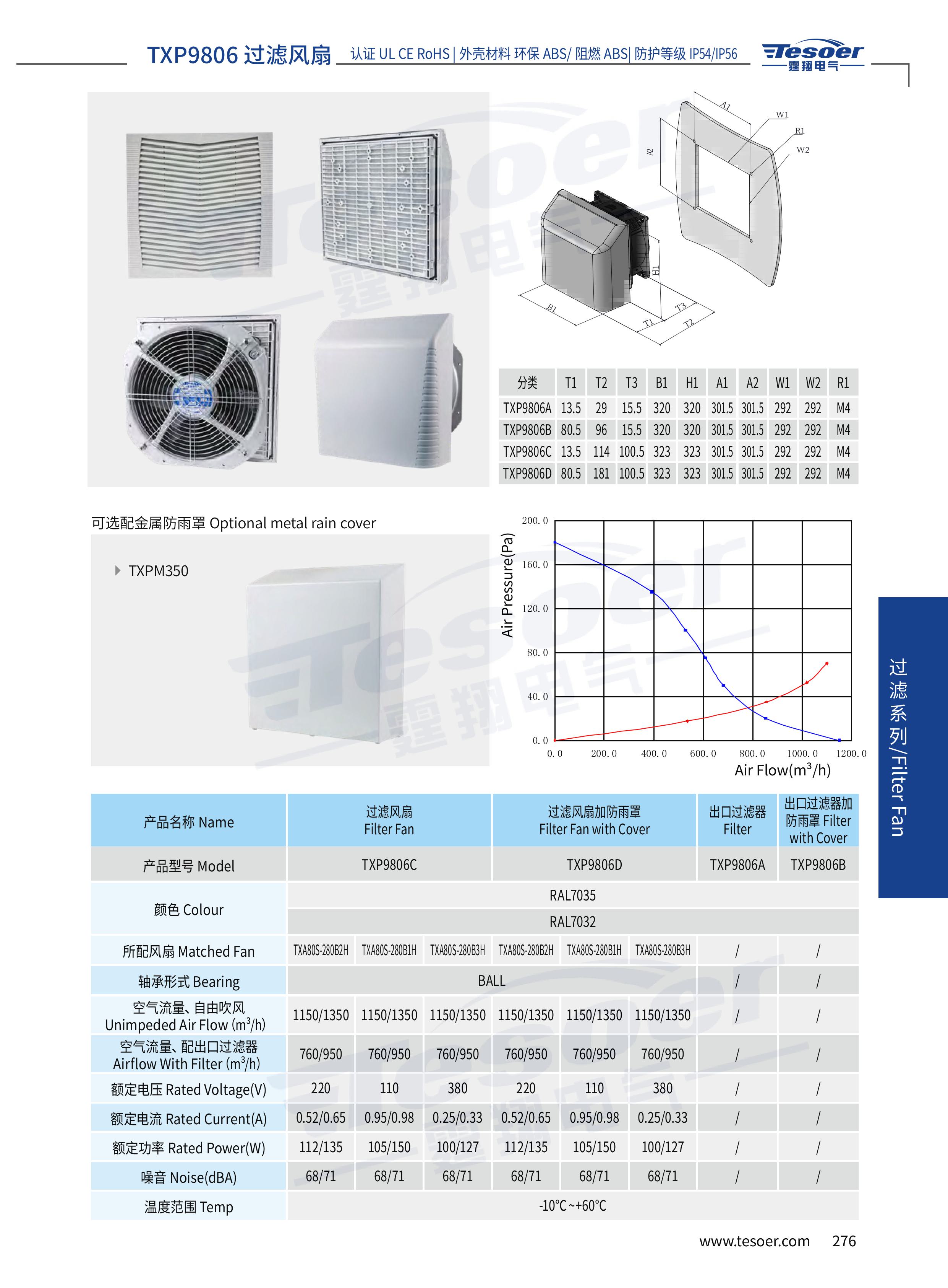 TXP系列風扇及過濾器,一款過濾器可以配不同品種風機,能夠按照您的實際需求選擇適合您的風量與參數,過濾器的沿邊使用的是點膠機點出的發泡膠,密封效果好,可以防止部分雨水沿著過濾器開孔處進入控制柜中,無紡布纖維過濾棉用于防止10微米以上的灰塵顆粒,螺絲固定安裝,防護等級可達1P54/1P55級別。